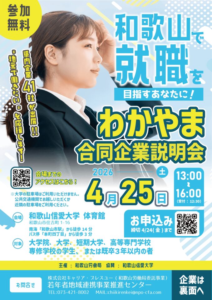 主催:和歌山労働局 協賛:和歌山信愛大学 お問合せ・運営:株式会社キャリア・ブレスユー(和歌山労働局委託事業)若年者地域連携事業推進センター |